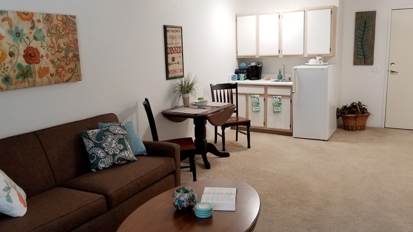 Your spacious apartment or cottage includes amenities that make life comfortable. Relax in your senior apartment with features like a walk-in shower or tub and modern kitchenette – and enjoy perfect room temperature thanks to self-controlled heat and air.